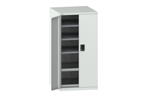Premiumhurts från LISTA. Verktygshurtsen är tillverkad i en kraftig plåtkonstruktion av allra högsta klass för användning i krävande miljöer. Hurtsen har dörrar, två utdragbara hyllor och tre fasta hyllplan som är justerbara i höjd med 25 mm intervaller. Verktygshurtsen har centrallås med tillhörande nyckel. Både stommen och dörrarna är lackerade i ljusgrå RAL 7035, hyllplan är lackerade i grå NCS S 4502-B.