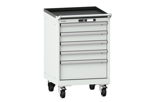 Mobil premiumhurts från LISTA. Verktygshurtsen är tillverkad i en kraftig plåtkonstruktion av allra högsta klass för användning i krävande miljöer och har en total lastkapacitet på upp till 400 kg. Utöver att den robusta konstruktionen är mycket stabil och säker tack vare dess anti-tilt funktion, är hurtsen även välskyddad och slittålig mot yttre påverkan. Samtliga lådor på hurtsen är fullt utdragbara samt utrustade med lådspärr och anti-tilt funktion som gör att det endast går att ha en låda ute i taget. Verktygshurtsen har centrallås med tillhörande nyckel och är utrustad med ett topplan i plåt med ribbad gummimatta, skjuthandtag och gummihjul (100 mm). Både stommen och lådorna är lackerade i ljusgrå RAL 7035.