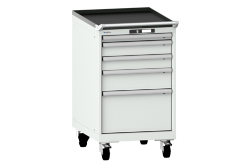 Mobil premiumhurts från LISTA. Verktygshurtsen är tillverkad i en kraftig plåtkonstruktion av allra högsta klass för användning i krävande miljöer och har en total lastkapacitet på upp till 400 kg. Utöver att den robusta konstruktionen är mycket stabil och säker tack vare dess anti-tilt funktion, är hurtsen även välskyddad och slittålig mot yttre påverkan. Samtliga lådor på hurtsen är fullt utdragbara samt utrustade med lådspärr och anti-tilt funktion som gör att det endast går att ha en låda ute i taget. Verktygshurtsen har centrallås med tillhörande nyckel och är utrustad med ett topplan i plåt med ribbad gummimatta, skjuthandtag och gummihjul (100 mm). Både stommen och lådorna är lackerade i ljusgrå RAL 7035.