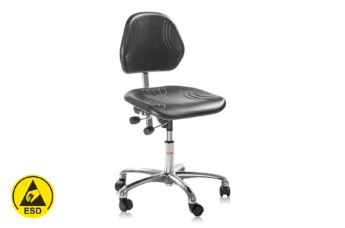Klassisk arbetsstol med både sits och rygg i avledande PU-material. Steglöst vinklingsbar rygg- och sitslutning för optimal sittposition och ökad ergonomi. Arbetsstolen har ett fotkryss i polerad aluminium och är utrustad med lättrullande ESD-hjul som gör det enkelt att förflytta sig kring arbetsstationen. Höjdinställning 500–630 mm.