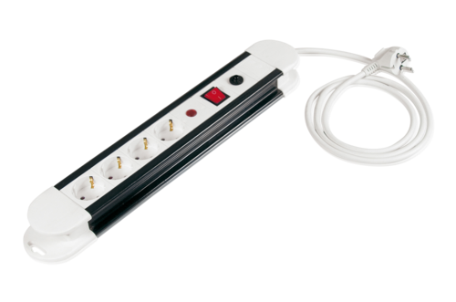4-vägs grenuttag med överspänningskydd och upplyst strömbrytare. Snedställda uttag som ger plats för fler transformatorer och 1,5 meter förlängningsladd.