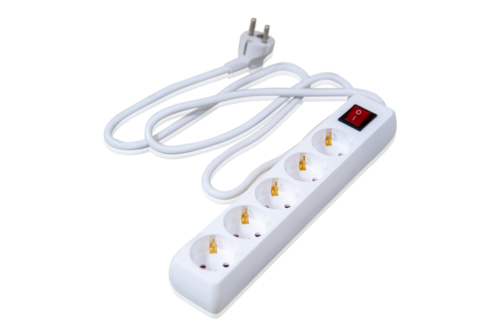 5-vägs grenuttag med upplyst strömbrytare. Snedställda uttag som ger plats för fler transformatorer och 1,4 meter förlängningsladd.