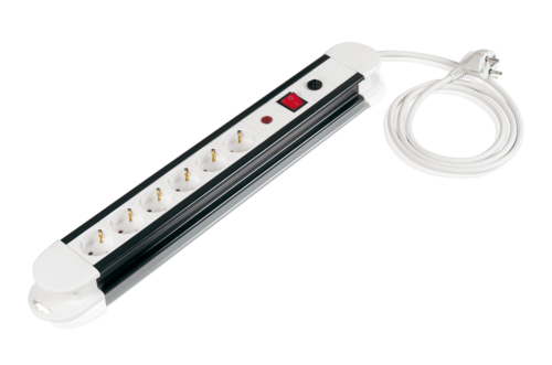 6-vägs grenuttag med överspänningskydd och upplyst strömbrytare. Snedställda uttag som ger plats för fler transformatorer och 1,5 meter förlängningsladd.