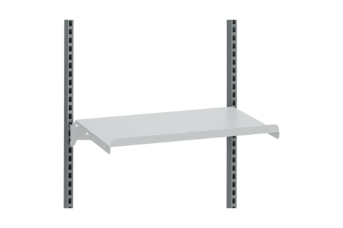 Hyllplan med raskant för verktyg och plastbackar. Inkluderar 2 stycken konsoler. Monteras på perforerad pelare, rak eller vinklad. Grålackerad, RAL 7035.