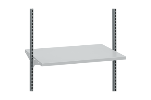 Hyllplan för verktyg och lådor. Inkluderar 2 stycken konsoler. Monteras på pelare i rakt läge. Ej vinklingsbart. Grålackerad, RAL 7035.