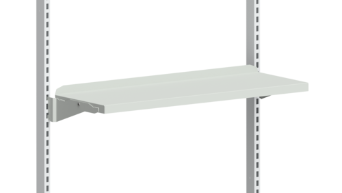 Hyllplan med raskant, som passar för verktyg och plastbackar. Hyllplanet monteras rakt eller vinklat på perforerade pelare. Hyllplanet är vändbart så att raskanten kan vara antingen utåt eller mot pelarna.