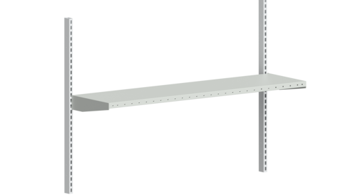 Packbordshylla inklusive konsoler för montering mellan perforerade pelare. Hyllplanet har hål i framkant för infästning av avdelare.Produktspecifikation - Packbordshylla 1400x360 mm - Ljusgrå