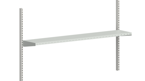Packbordshylla inklusive konsoler för montering mellan perforerade pelare. Hyllplanet har hål i framkant för infästning av avdelare.Produktspecifikation - Packbordshylla 1600x300 - Ljusgrå