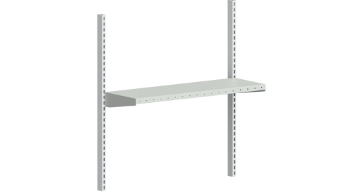 Packbordshylla inklusive konsoler för montering mellan perforerade pelare. Hyllplanet har hål i framkant för infästning av avdelareProduktspecifikation - Packbordshylla 900x300 mm, Ljusgrå