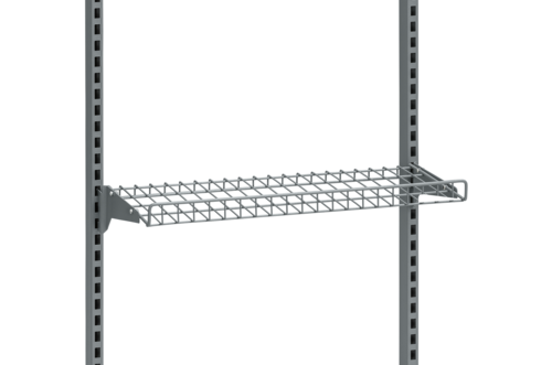 Trådhyllplan med bockad framkant som fixeras med hjälp av konsoler i vinklat eller horisontellt läge.