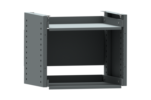 Denna variant (komplett 2) består av ett par konsoler och två hyllplan. Går även att komplettera med fler hyllplan och tillhörande lådfront. Lådfronten monteras enkelt utan verktyg.
