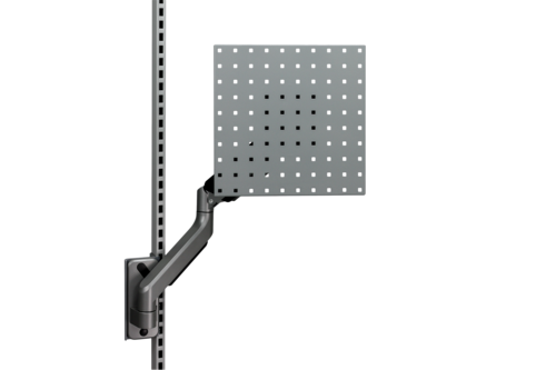 Perforerad panel på gasfjäderarm. Perfekt för smidig och ergonomisk verktygsupphängning runt omkring arbetsplatsen, verktygen blir både enklare att få undan och nå under arbetets gång. Gasfjäderarm med ställbar tilt som klarar en belastning på upp till 15 kg. Fästes på perforerad pelare med stolpfäste. Stolpfäste ingår.