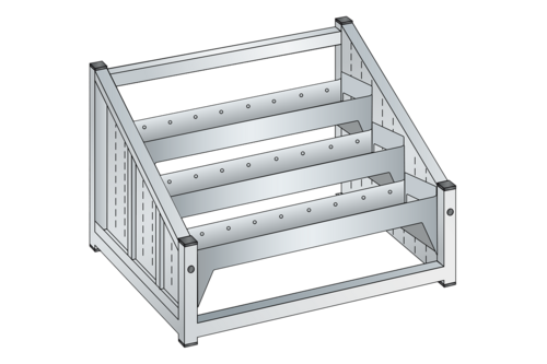 NC bänkstativ från LISTA. Robust och stabilt stativ med tre verktygsvaggor och tre par horisontella konsoler. Verktygsvaggorna skapar ett säkert stöd för verktygshållarna. Tillverkad av rör och plåt.