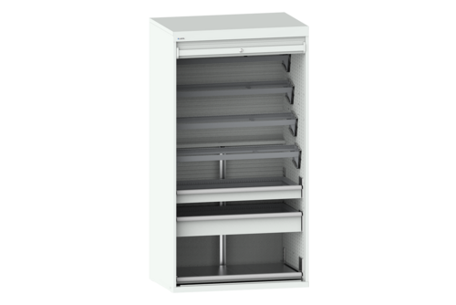 Det integrerade jalusit i plast har ett praktiskt infällt grepp med en modulär V-hylsa och 67 mm spärr. Skåpet är utrustat med cylinderlås och fyra verktygsvaggor med konsoler vinklingsbara upp till 15°, samt en låda med fronthöjd 100 mm, en låda med fronthöjd 150 mm och en utdragbar hylla. Det finns även en lådblockering som gör att det bara går att ha en låda utdragen för att förhindra tipprisk. Levereras exklusive verktygshållare.
