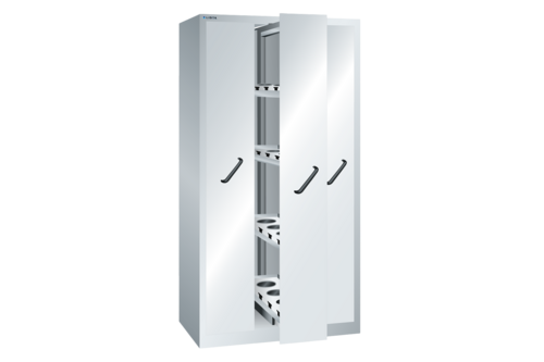 Utdragbart CNC skåp från LISTA. Verktygsskåp med utdragbara kassetter för montering av hyllplan eller verktygshållare. Åtkomst av verktyg från båda sidorna. Skåpet är tillverkat i en kraftig plåtkonstruktion med tre rejäla utdragenheter och är riktigt stabilt. Det ingår fyra justerbara hyllor för verktygshållare till varje kassett, verktygshållare köps separat.