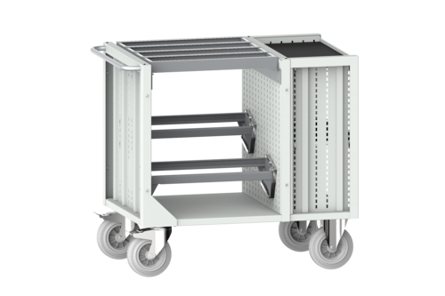 Komplett NC vagn från LISTA. Vagnen är tillverkad i en kraftig konstruktion med sidopaneler som är förstärkta med bockad plåt, 200 mm gummihjul och skjuthandtag. En komplett vagn som levereras med en insatsram, två verktygsvaggor och två hyllplan med gummimatta. Kompletteras med verktygshållare.