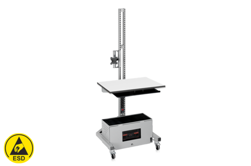 Flexibel arbetsstation anpassad för ESD-miljö. Fungerar utmärkt exempelvis som it-station eller arbetsyta för enklare monteringsarbete. Levereras med ett batteripack som räcker en hel arbetsdag och har en kapacitet på 2400W (laddas med bifogad kabel i vanligt vägguttag). Arbetsstationen är manuellt höjdjusterbar och utrustad med en ESD-bordsskiva samt fyra svängbara hjul, varav två med broms (hjuldiameter 100 mm). Tack vare att konstruktionen även innefattar två sammansvetsade perforerade pelare är det möjligt att montera ett flertal standardtillbehör, som ledbara armar, skärmhållare och hyllplan. Lastkapacitet 50 kg fördelad vikt.