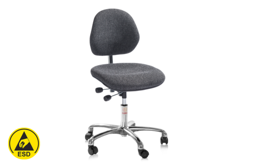 Klassisk arbetsstol med både sits och rygg i gråmelerat avledande tyg. Steglöst vinklingsbar rygg- och sitslutning för optimal sittposition och ökad ergonomi. Arbetsstolen har ett fotkryss i polerad aluminium och är utrustad med lättrullande ESD-hjul som gör det enkelt att förflytta sig kring arbetsstationen. Höjdinställning 500–630 mm.
