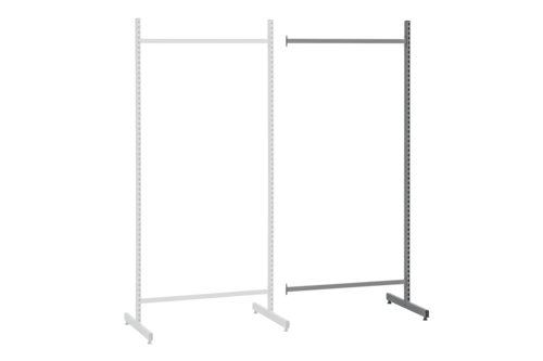 Fristående dubbelställ (tilläggssektion) för placering på golv. Dubbelstället har dubbelfot och placeras med fördel fritt i lokalen för åtkomst till materialet från båda sidor. Går att bygga på och komplettera med valfria tillbehör efter behov, välj mellan allt från backlister och perforerade paneler till olika typer av hyllplan och plastbackar. Anpassat för vårt tillbehörssortiment c/c 900 mm. Tillverkat i perforerad rörprofil (50x25 mm) och pulverlackerat i grå NCS 6502B. Lastkapacitet 150 kg fördelad vikt.