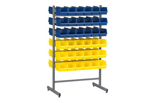 Fristående komplett dubbelställ inklusive 72 plastbackar (4 liter), 36 blå och 36 gula. Dubbelstället har dubbelfot och placeras med fördel fritt i lokalen för åtkomst till materialet från båda sidor. Anpassat för vårt tillbehörssortiment c/c 900 mm. Tillverkat i perforerad rörprofil (50x25 mm) och pulverlackerat i grå NCS 6502B. Lastkapacitet 150 kg fördelad vikt.