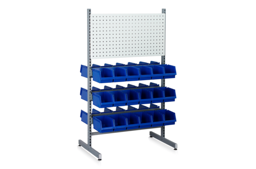 Fristående komplett dubbelställ inklusive 6 upphängningsskenor, 36 plastbackar och 2 perforerade paneler. Dubbelstället har dubbelfot och placeras med fördel fritt i lokalen för åtkomst till materialet från båda sidor. Anpassat för vårt tillbehörssortiment c/c 900 mm. Tillverkat i perforerad rörprofil (50x25 mm) och pulverlackerat i grå NCS 6502B. Lastkapacitet 150 kg fördelad vikt.
