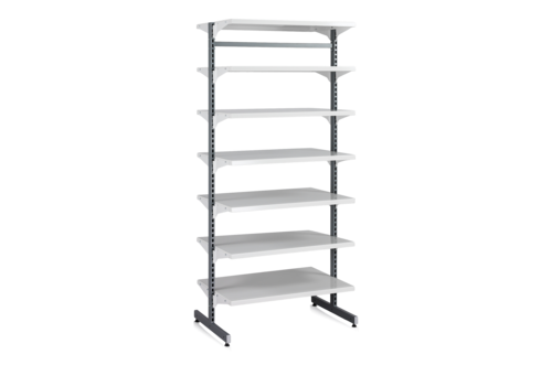 Fristående komplett dubbelställ inklusive 7 hyllplan. Dubbelstället har dubbelfot och placeras med fördel fritt i lokalen för åtkomst till materialet från båda sidor. Anpassat för vårt tillbehörssortiment c/c 900 mm. Tillverkat i perforerad rörprofil (50x25 mm) och pulverlackerat i grå NCS 6502B. Lastkapacitet 150 kg fördelad vikt.