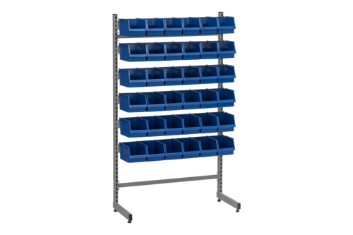 Fristående komplett enkelställ inklusive 36 blå plastbackar (4 liter). Enkelstället har enkelfot och kan placeras både mot en vägg eller fritt i lokalen. Anpassat för vårt tillbehörssortiment c/c 900 mm. Tillverkat i perforerad rörprofil (50x25 mm) och pulverlackerat i grå NCS 6502B. Lastkapacitet 100 kg fördelad vikt.