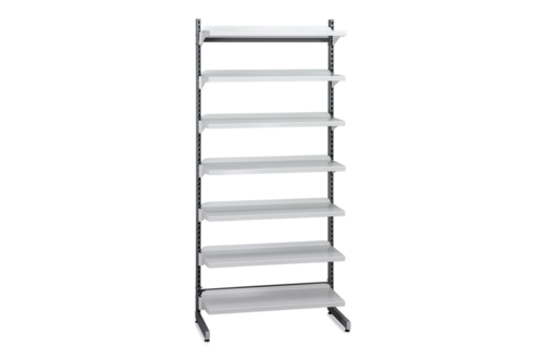 Fristående komplett enkelställ inklusive 7 hyllplan. Hyllplanen är 300 mm djupa. Enkelstället har enkelfot och kan placeras både mot en vägg eller fritt i lokalen. Anpassat för vårt tillbehörssortiment c/c 900 mm. Tillverkat i perforerad rörprofil (50x25 mm) och pulverlackerat i grå NCS 6502B. Lastkapacitet 100 kg fördelad vikt.