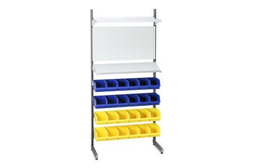Fristående komplett enkelställ inklusive 1 perforerad panel, 2 hyllplan och 24 plastbackar. Enkelstället har enkelfot och kan placeras både mot en vägg eller fritt i lokalen. Anpassat för vårt tillbehörssortiment c/c 900 mm. Tillverkat i perforerad rörprofil (50x25 mm) och pulverlackerat i grå NCS 6502B. Lastkapacitet 100 kg fördelad vikt.