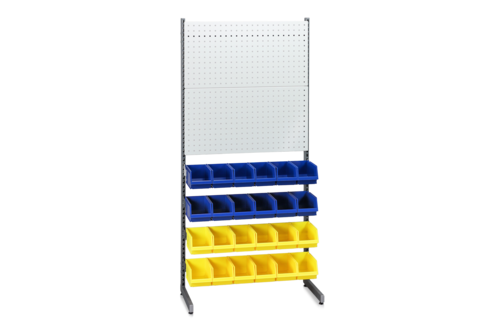 Fristående komplett enkelställ inklusive 2 perforerade paneler och 24 plastbackar. Enkelstället har enkelfot och kan placeras både mot en vägg eller fritt i lokalen. Anpassat för vårt tillbehörssortiment c/c 900 mm. Tillverkat i perforerad rörprofil (50x25 mm) och pulverlackerat i grå NCS 6502B. Lastkapacitet 100 kg fördelad vikt.
