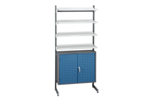 Fristående komplett enkelställ inklusive 4 hyllplan och 1 perforerat verktygsskåp. Hyllplanen är 300 mm djupa. Enkelstället har enkelfot och kan placeras både mot en vägg eller fritt i lokalen. Anpassat för vårt tillbehörssortiment c/c 900 mm. Tillverkat i perforerad rörprofil (50x25 mm) och pulverlackerat i grå NCS 6502B. Lastkapacitet 100 kg fördelad vikt.