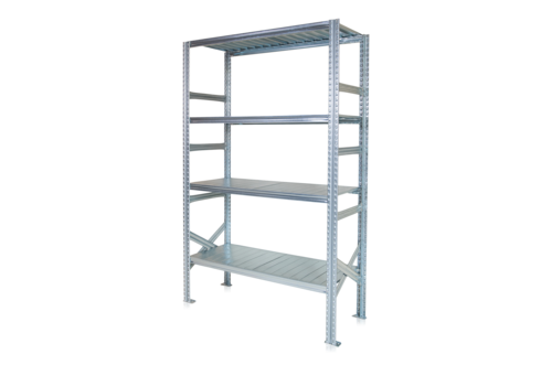 Sektion med fyra hyllplan för förvaring på lager, industri eller arkiv. Hyllstället är tillverkat av galvaniserat högkvalitativt stål som har hög belastningskapacitet, men låg produktvikt. Varje enskilt hyllplan har en lastkapacitet på 205 kg. Hyllsystemet är enkelt att montera och det behövs varken skruv eller bult. Det går även bra att bygga vidare med flera följesektioner.