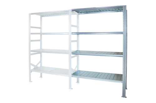Påbyggnadssektion till startsektion. Bestående av fyra hyllplan för förvaring på lager, industri eller arkiv. Hyllstället är tillverkat av galvaniserat högkvalitativt stål som har hög belastningskapacitet, men låg produktvikt. Varje enskilt hyllplan har en lastkapacitet på 205 kg. Hyllsystemet är enkelt att montera och det behövs varken skruv eller bult. Det går även bra att bygga vidare med flera följesektioner.