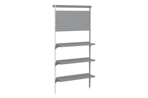 Tilläggssektionen består av 1 bärlist (1000 mm), 1 perforerad väggskena (2000 mm), 3 hyllplan (875x300 mm) och 1 perforerad panel. Hyllplanen och panelen är enkla att höjdjustera. Hyllplanen kan dessutom vinklas.
