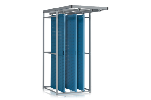 Vår kraftigaste modell av verktygsupphängning som klarar en total belastning av 1200 kg. Kassetterna är fullt utdragbara för att det ska gå att använda hela ytan. Kompaktfacket består av tre dubbelsidiga paneler utrustade med kullagrad rullvagn för smidig hantering. Panelerna är flyttbara i sidled med cc18mm för optimal användning. Total upphängningsyta på denna modell är 10,8 m2. (1,8 m2/panel).