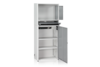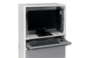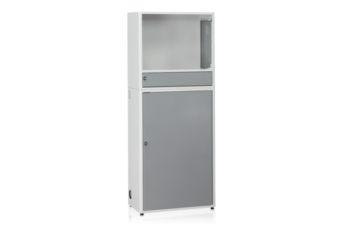 Komplett datorskåp för industri och lager. Skåpet skyddar din dator från damm och smuts på ett effektivt sätt, och är samtidigt fullt ventilerbart. Fläkt monteras på insidan av underskåpet. Överskåpet har en stor fönsterruta med plats för skärmar upp till 27” och en lucka med utdragbar tangentbordshylla 200 mm. Underskåpet har två perforerade hyllplan som är flyttbara i höjdled och skapar gott om förvaringsplats. Kabelgenomföring mellan det övre och undre skåpet. Båda delarna är låsbara med nyckel.