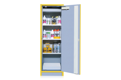 Kemikalieskåp med bottentråg och tre flyttbara hyllplan. Skåpet är brandtestat 30 minuter enligt EN 14470-1. Utrustat med självstängande dörrar som dessutom är uppställningsbara, dessa stängs automatiskt vid en temperaturstegring på 50°C i rummet. Dörrar låses separat. Anslutningsstos (Ø100 mm) för till- och frånluft.