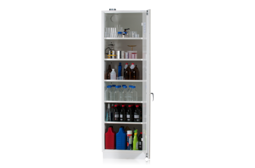 Brandisolerat kemikalieskåp för förvaring av brandfarliga och giftiga kemikalier. Utrustat med fem flyttbara hyllplan. Hyllorna har uppvikta kanter och slutna hörn för att förhindra avrinning av spill. Brandskåpet kan också utrustas med ett uppsamlingstråg i botten för förvaring av större dunkar. Skåpet är försett med ventilationskanal med utsugspunkter som bidrar till att mellanrummet mellan alla hyllplan ventileras. Luftsstos på skåpets tak (Ø 100 mm).