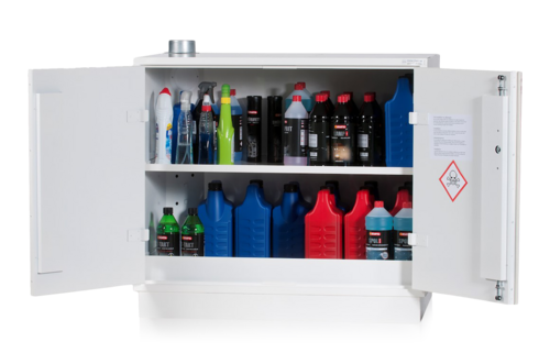 Brandisolerat kemikalieskåp för förvaring av brandfarliga och giftiga kemikalier. Utrustat med ett flyttbart hyllplan och kan kompletteras med flera. Hyllorna har uppvikta kanter och slutna hörn för att förhindra avrinning av spill. Brandskåpet kan också utrustas med ett uppsamlingstråg i botten för förvaring av större dunkar. Skåpet är försett med ventilationskanal med utsugspunkter som bidrar till att mellanrummet mellan alla hyllplan ventileras. Luftsstos på skåpets tak (Ø 100 mm).