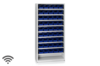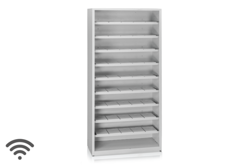 Komplett automatiskt inventeringsskåp. Skåpet är utrustat med vågelement och sensorer som väger varje produkt på lagerplatsen i realtid för att hålla koll på saldo, förbrukning och beställningsnivåer – helt automatiskt och dygnet runt. Ett smart skåp som ser till att du slipper manuell inventering och alltid har korrekt lagerstatus direkt i systemet. Det här backskåpet har nio hyllplan med plats för fem vågceller på varje hyllplan. Våra plastbackar med en kapacitet på fyra liter passar utmärkt här.