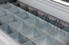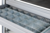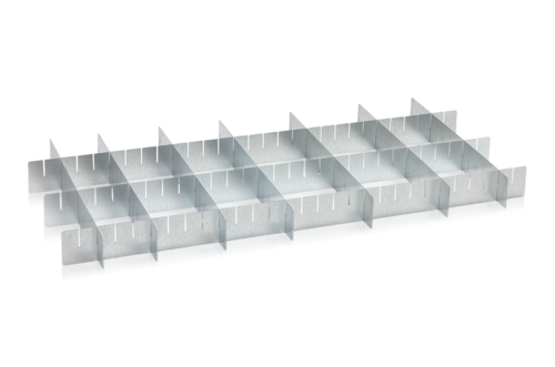 Inredning för utdragbar låda, består av 3 + 7 slitsade plåtprofiler.