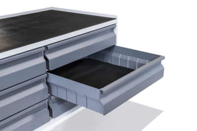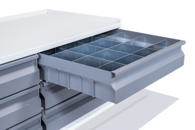 Lådinsats för verkstadsskåp. Placeras på hyllplan. Bestående av 6 stycken lådor med slitsade insidor. Levereras exklusive mellanväggar och avdelare.