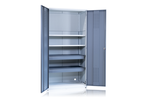Ett robust verkstadsskåp tillverkat i en helsvetsad konstruktion av stålplåt. Passar för krävande miljöer som verkstäder och lager men lämpar sig även som kontors- eller arkivskåp. Skåpet är utrustat med justerbara fötter som gör att det står stadigt även på ojämna underlag och klarar en sammanlagd belastning på 500 kg. Lackerat grått i två nyanser. Den mörka nyansen på dörrarna för att minska risken för smuts och fingeravtryck. Väggskenor i ryggen gör skåpet flexibelt att placera de olika tillbehören på anpassad plats.