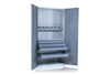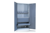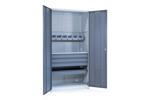 Ett robust verkstadsskåp tillverkat i en helsvetsad konstruktion av stålplåt. Passar för krävande miljöer som verkstäder och lager men lämpar sig även som kontors- eller arkivskåp. Skåpet är utrustat med justerbara fötter som gör att det står stadigt även på ojämna underlag och klarar en sammanlagd belastning på 500 kg. Lackerat grått i två nyanser. Den mörka nyansen på dörrarna för att minska risken för smuts och fingeravtryck. Väggskenor i ryggen gör skåpet flexibelt att placera de olika tillbehören på anpassad plats.