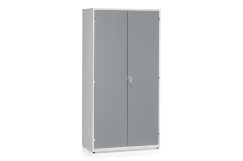 Ett robust verkstadsskåp tillverkat i en helsvetsad konstruktion av stålplåt. Passar för krävande miljöer som verkstäder och lager men det lämpar sig även som kontors- eller arkivskåp. Skåpet är utrustat med justerbara fötter som gör att det står stadigt även på ojämna underlag och klarar en sammanlagd belastning på 500 kg. Lackerat grått i två nyanser. Den mörka nyansen på dörrarna för att minska risken för smuts och fingeravtryck. Väggskenor i ryggen gör skåpet flexibelt att placera de olika tillbehören på anpassad plats.