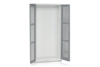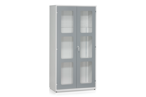Verkstadsskåp tillverkat i en helsvetsad konstruktion av stålplåt och utrustat med plexiglasdörrar. Passar för krävande miljöer som verkstäder och lager men lämpar sig även som kontors- eller arkivskåp. Skåpet är utrustat med justerbara fötter som gör att det står stadigt även på ojämna underlag och klarar en sammanlagd belastning på 500 kg. Lackerat grått i två nyanser. Den mörka nyansen på dörrarna för att minska risken för smuts och fingeravtryck. Väggskenor i ryggen gör skåpet flexibelt att placera de olika tillbehören på anpassad plats.