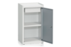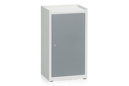 Verkstadsskåp i plåt, helsvetsad konstruktion. Ett flyttbart hyllplan samt en utdragbar låda högst upp i skåpet. Avlastningsplan med raskant på ovansida. Stommen i ljusgrå och dörren i mörkgrå.