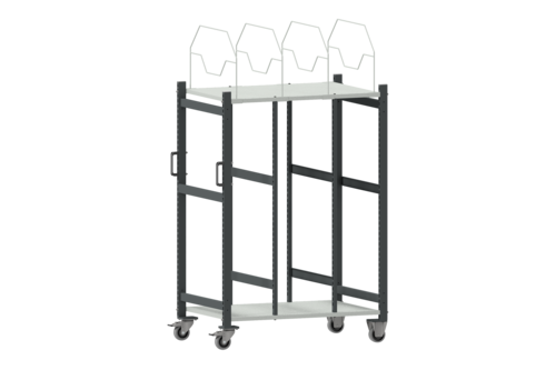 Mångsidig kartongvagn som fungerar perfekt som mobil lagringsyta för emballage. Vagnen har tre olika fack för stående förvaring och ett hyllplan med tillhörande avdelare upptill. De vertikala avdelarna är tillverkade av rör som skapar en riktigt stabil konstruktion och är även ställbara i sidled med 50 mm intervall. Ett flyttbart mittstöd i plåt gör hanteringen flexibel. Hyllplanen på vagnen är 100 mm breda och 695 mm djupa, de tillhörande avdelarna är flyttbara utan skruv och har en höjd på 400 mm. Vagnen är utrustad med fyra hjul, varav två svängbara med broms. Lastkapacitet 200 kg fördelad vikt.