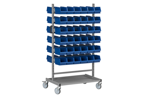 Komplett montörvagn i perforerade rörprofiler (50x25 mm) med bottenhyllplan, mellanstag, handtag, hjulsats, 12 upphängningsskenor och 72 blå plastbackar (varje back rymmer 4 l). Hjulsatsen består av 4 länkhjul (hjuldiameter 125 mm), varav 2 är utrustade med broms. Vagnen klarar en maximal belastning på 150 kg fördelad last.