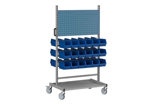 Komplett montörvagn i perforerade rörprofiler (50x25 mm) med bottenhyllplan, mellanstag, handtag, hjulsats, 6 upphängningsskenor, 2 blå perforerade paneler (896x480 mm) och 36 blå plastbackar (varje back rymmer 4 l). Hjulsatsen består av 4 länkhjul (hjuldiameter 125 mm), varav 2 är utrustade med broms. Vagnen klarar en maximal belastning på 150 kg fördelad last.